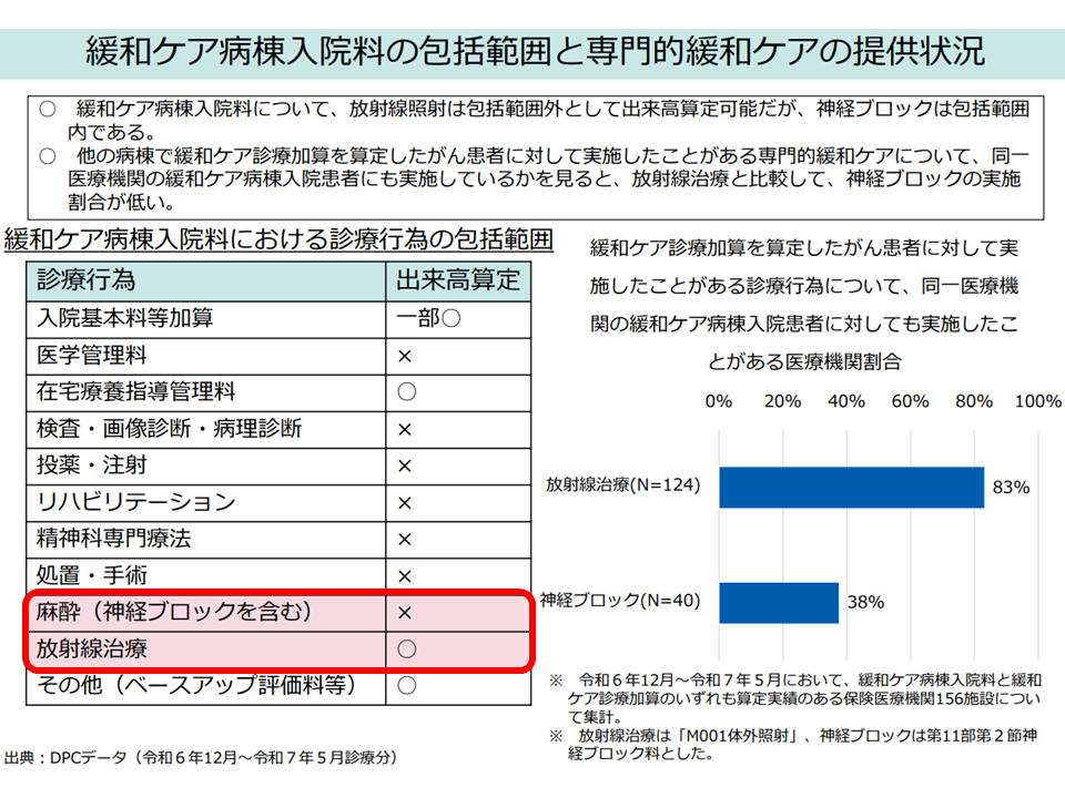 ▽A310【緩和ケア病棟入院料】(緩和ケアを要する悪性腫瘍および後天性免疫不全症候群(エイズ)の患者が対象)では、「緩和的放射線照射」は包括範囲外(出来高算定○)だが、「神経ブロック」は包括範囲内(出来高算定×)となっている点を見直してはどうか(神経ブロックの疼痛緩和効果は大きく、出来高算定を認めることが考えられる)