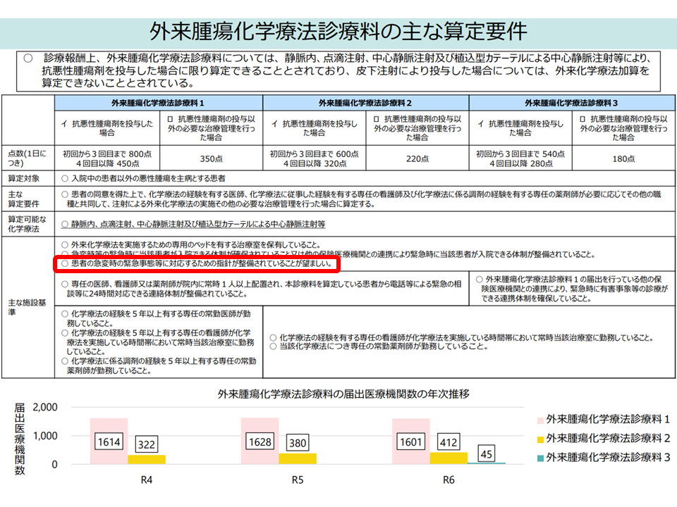 また、【外来腫瘍化学療法診療料】には「患者の急変時の緊急事態等に対応するための指針が整備されていることが望ましい」旨の施設基準が設けられています。「抗がん剤投与の副反応への体制」が整備されていることで、患者が安心して「外来」で抗がん剤治療を受けられるようになるためです。