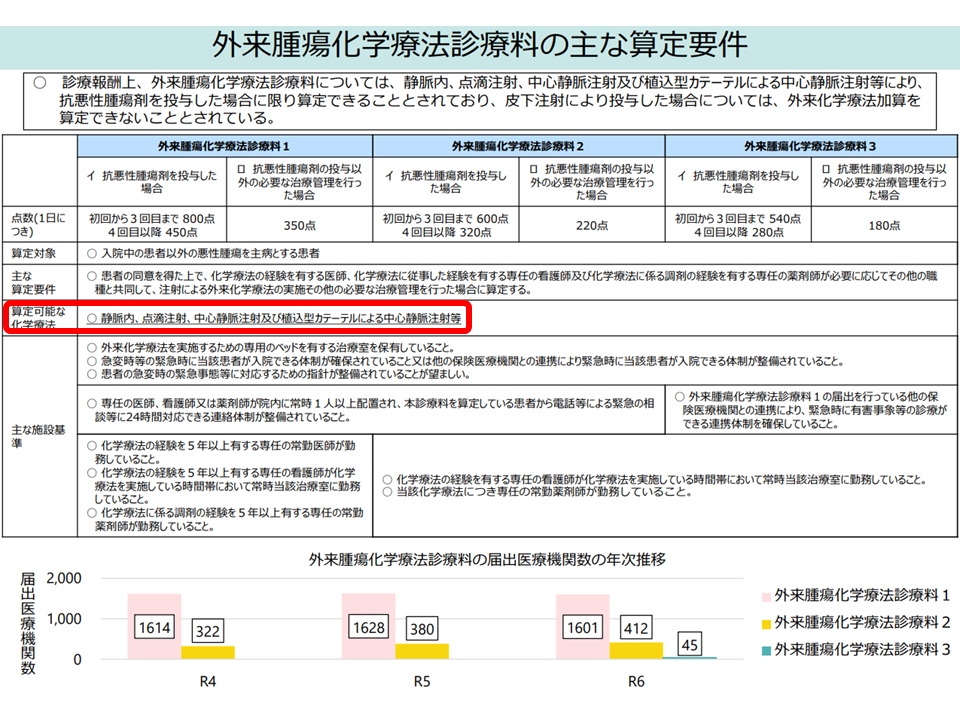 ところで、この【外来腫瘍化学療法診療料】の対象となる化学療法は「静脈内、点滴注射、中心静脈注射、植込型カテーテルによる中心静脈注射等」とされ、「皮下注製剤」は含まれていません。