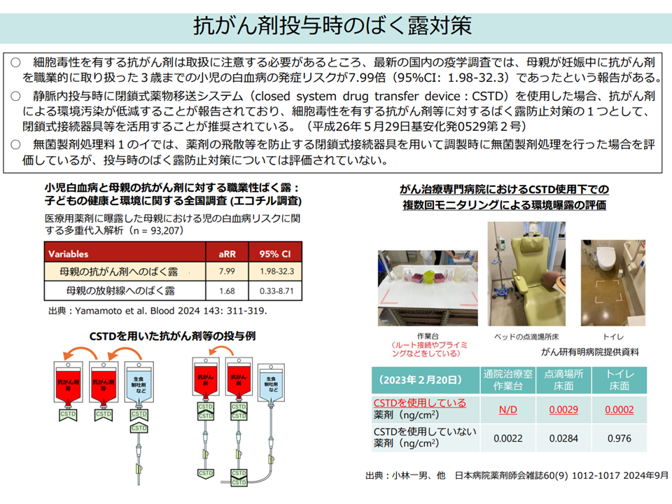 (5)細胞毒性を有する抗がん剤は取扱に注意する必要があり、▼本邦調査で「母親が妊娠中に抗がん剤を職業的に取り扱った場合、3歳までの小児の白血病発症リスクが7.99倍となる」などの報告がある▼CSTD(閉鎖式薬物移送システム)の使用で抗がん剤による環境汚染が低減するとの報告がある—ことなどを踏まえ、G020【無菌製剤処理料】等で抗がん剤投与時のばく露予防を評価する(診療側の小阪真二委員(全国自治体病院協議会副会長)は「抗がん剤投与患者の尿からのばく露予防」も検討すべきと要望)