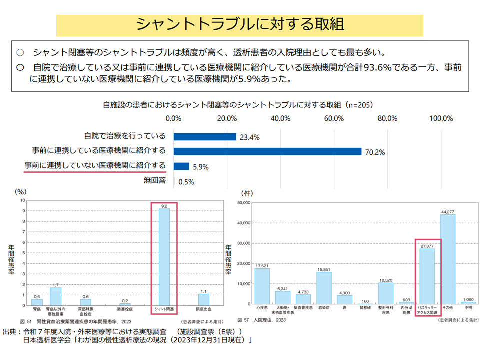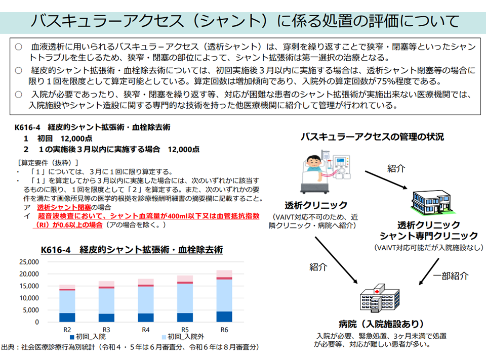 ▽シャント閉塞などの「シャントトラブル」に対し、▼自院で治療する施設▼事前に連携している医療機関に紹介する施設▼連携していない医療機関に紹介する施設—がある点を踏まえて、「慢性維持透析患者のシャントトラブルへの対応に関する評価」のあり方をどう考えるか(K616-4【経皮的シャント拡張術・血栓除去術】を、医療機関の対応状況別に区分して点数設定する(連携なし医療機関への紹介は低い点数とするなど)ことが考えられる)