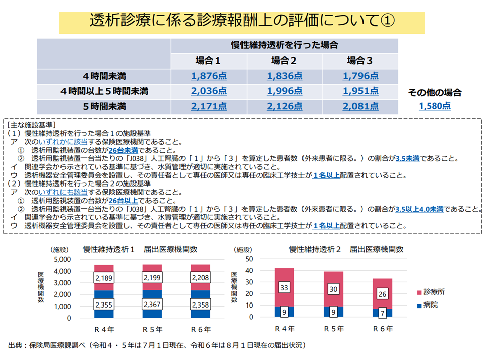 この点について支払側の松本委員は「適正化」方向を強く要請しましたが、診療側の太田圭洋委員(日本医療法人協会副会長)は「効率的な医療提供を行うことは悪いことなのだろうか?現在は『効率性が高い』場合(場合2、場合3)は低い点数が設定され、これによって『場合2、場合3の対象にならないように、患者が多い場合には別施設で透析治療を行う』ような弊害・副作用も出てしまっている。『効率性が高い=悪』ではなく、むしろ患者にとっては『良い』ことである。場合2・場合3の廃止も含めた検討が必要である」と適正化方向に強く反対しています。また診療側の江澤委員も現在の点数設定方法(効率性の高い施設で低い点数とする仕組み)に疑問を呈し、「医療機関の経営状況も踏まえて、点数設定方式の妥当性を検証すべき」と注文しています。
