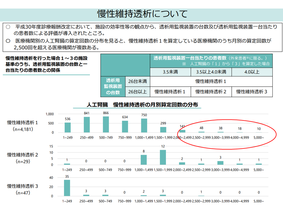 上記の「効率性」を踏まえれば、こうした「算定回数が非常に多い医療機関」は「効率的な透析医療を提供している」と考えられ、適正化(つまり低い点数設定)を行っていくことが考えられます。
