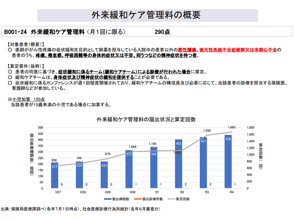 また診療報酬では【外来腫瘍化学療法診療料】が2022年度診療報酬改定で創設され、2024年度の前回診療報酬改定で「より質の高い外来がん化学療法の推進」・「外来がん化学療法の裾野拡大」対応が図られています。