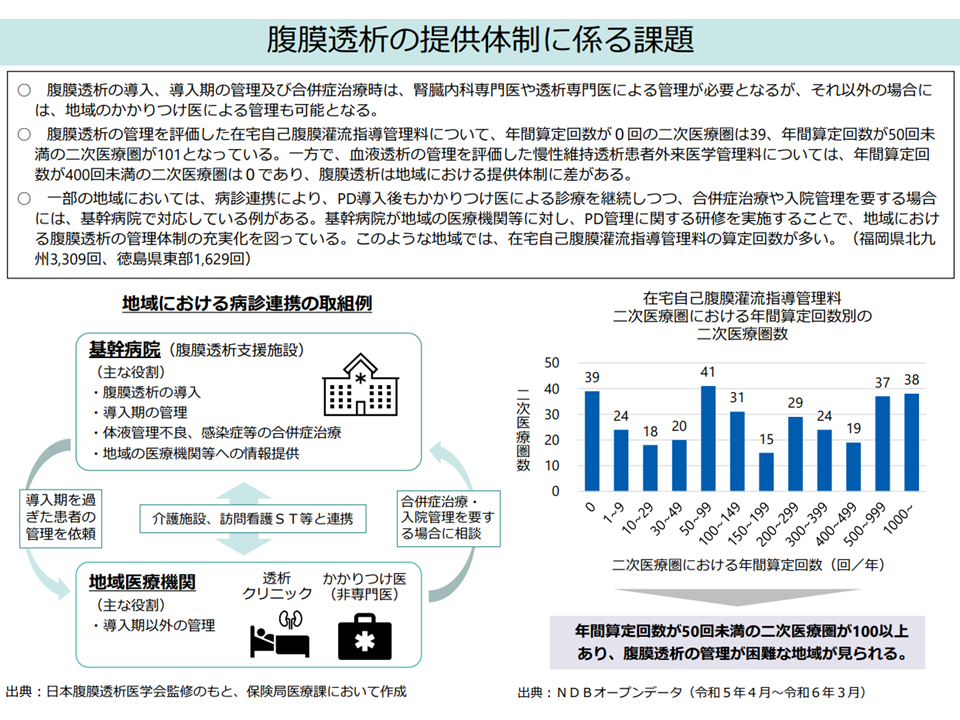 また、血液透析に比べて生活の制限や通院回数が少なく、患者の自由度が比較的高い「腹膜透析」(PD)については、▼患者の管理に地域差がある▼一部地域では、病診連携により腹膜透析導入後も「かかりつけ医による診療」を継続しつつ、合併症治療や入院管理を要する場合には「基幹病院」で対応する事例がある—点を踏まえた、C102【在宅自己腹膜灌流指導管理料】の算定要件見直しが論点となりました。