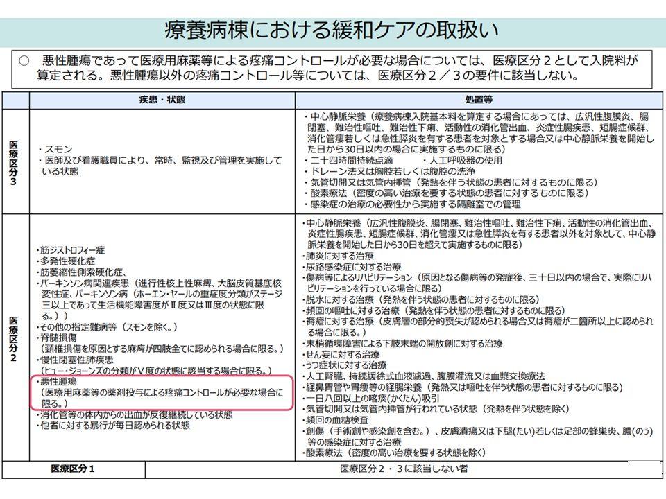 ▽療養病棟における「悪性腫瘍以外の医療用麻薬による疼痛コントロールを要する病態」について医療区分をどう考えるか(がん以外の病態で麻薬による疼痛コントロールが必要な患者も「医療区分2」とすることなどが考えられる)