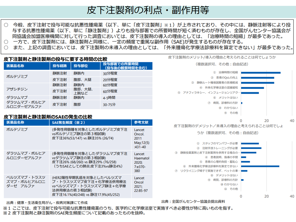 そこで中医協では「【外来腫瘍化学療法診療料】の対象に皮下注射も加える」ことに診療側・支払側の双方が同意しています。ただし支払側の松本真人委員(健康保険組合連合会理事)は「治療時間の短縮を評価(点数)にも反映させよ」と注文を付けており、今後の点数設定に注目が集まります。