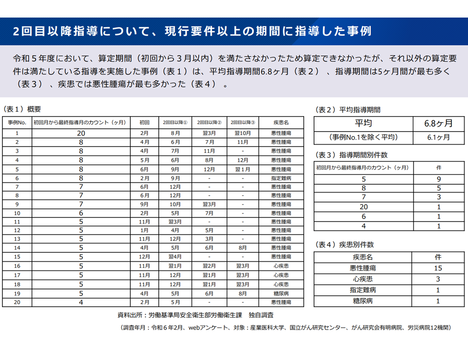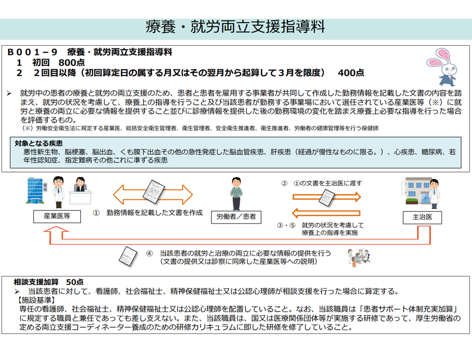 また、療養・就労両立支援指導料について、実態を踏まえた「算定対象(疾患、ケース)や算定期間の拡大」を図ってはどうか—。