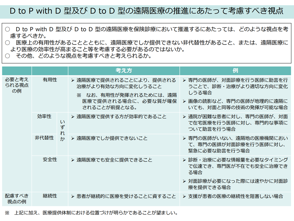 オンライン診療について、「有用性があるか?」「効率性が上がるか?非代替性があるか?」「安全性は確保されるか?」という視点で推進すべきか否かを判断してはどうか(この視点に立てば、例えばD to P with DやD to P with Nは推進していくことになろう)—。