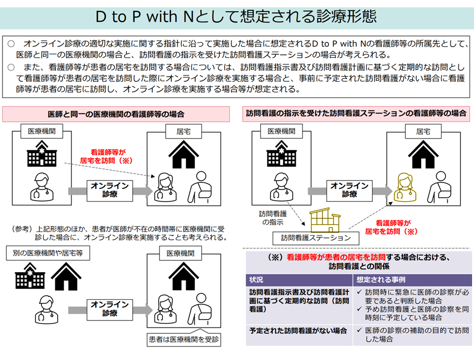 例えば、「D to P with N」には、(a)訪問看護指示書・訪問看護計画に基づく定期的な訪問として看護師等が患者の居宅を訪問した際にオンライン診療を実施する場合(下図の桃色の2ケース)(b)「事前に予定された訪問看護がない」場合に看護師等が患者の居宅に訪問し、オンライン診療を実施する場合(下図の(参考)に類似するケース)—などが想定されます。しかし(b)のケースは、現時点では「訪問看護指示書等がないため医療保険制度の中で実施できない」ことになりますが、患者の急変時などには有用性が高いため「実施可能とする方法がないか」を検討していくことが重要と考えられます。