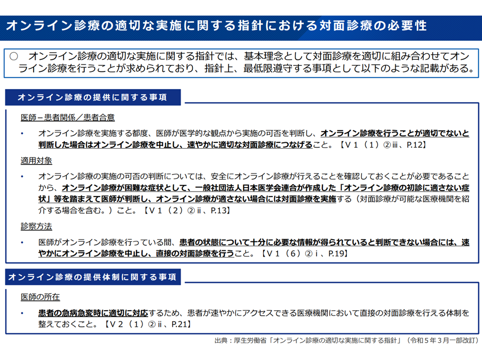 一部に不敵なオンライン診療のある可能性があり、「各種の指針やガイドライン遵守」を担保することをより強く求めていってはどうか—。