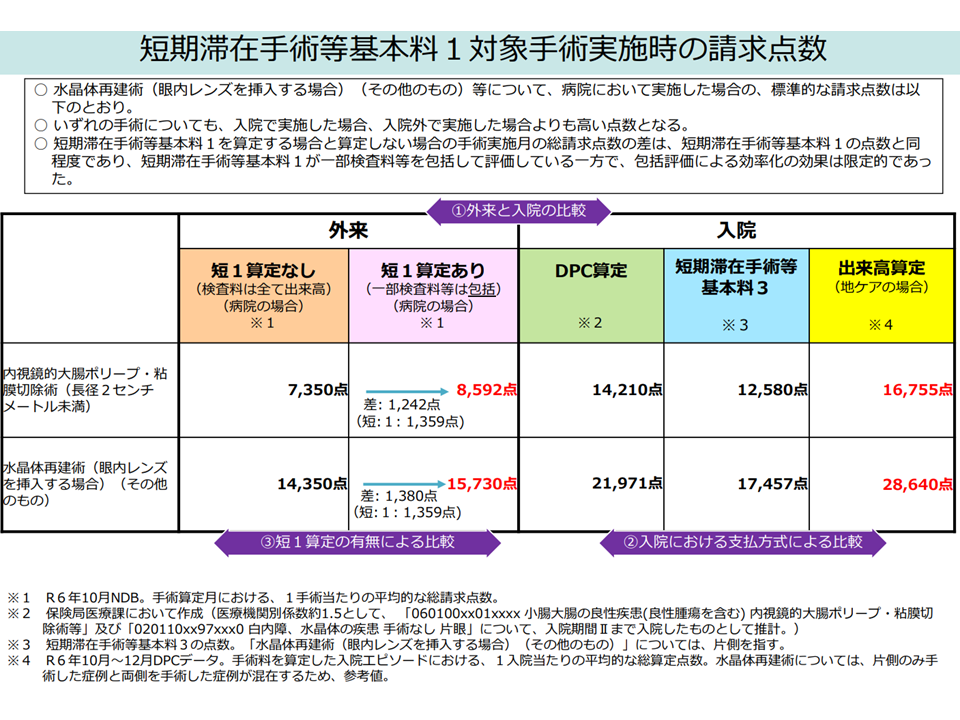 短期滞在手術等基本料の対象となっている手術(白内障手術など)については「入院での実施」から「外来での実施」を促進するために、例えば「入院で実施する場合の評価」(点数)の引き下げなどを行ってはどうか—。