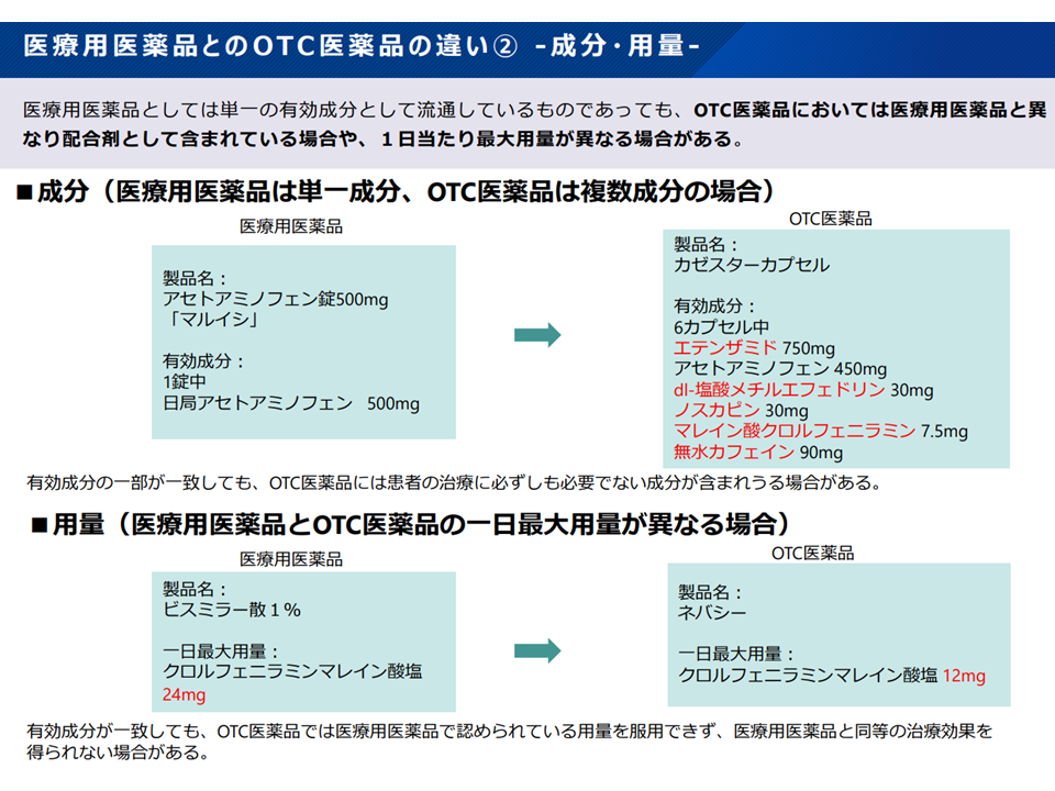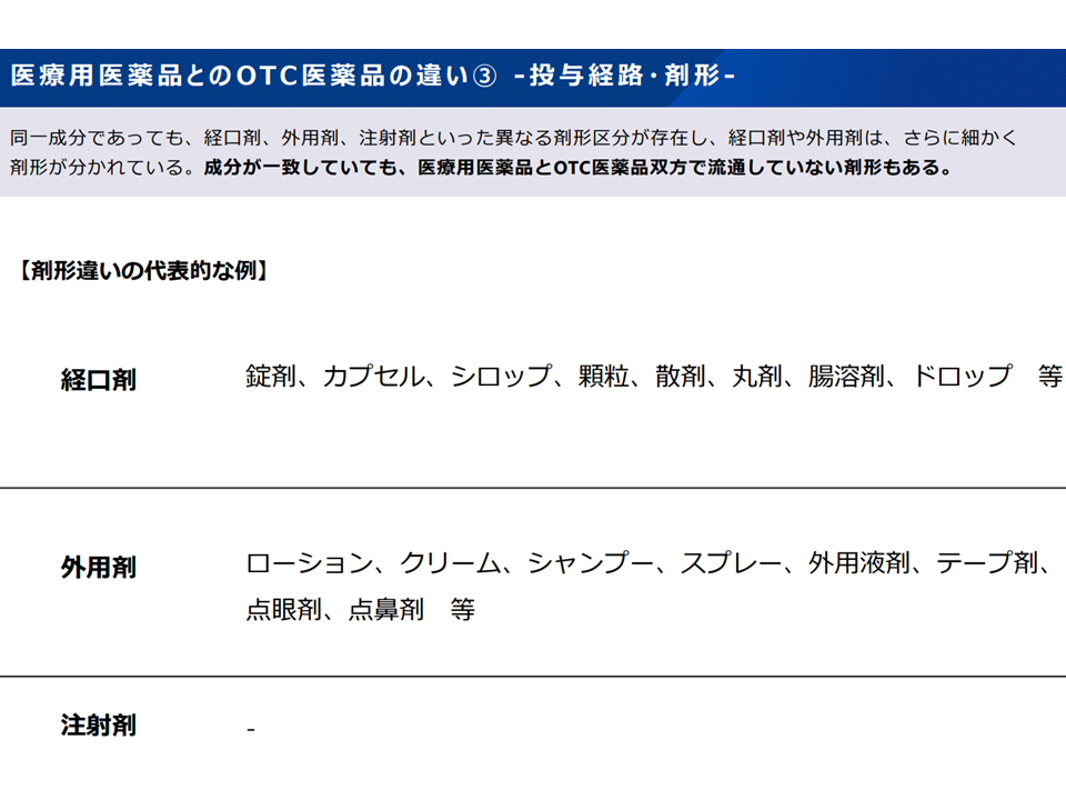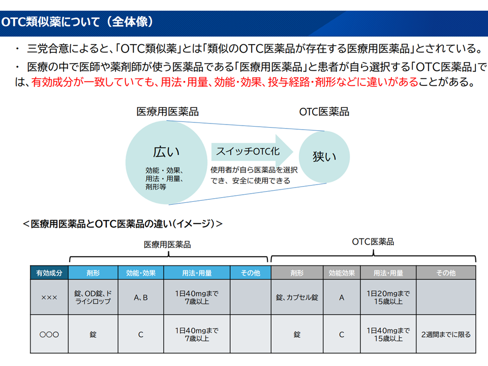 厚生労働省は関連して、OTC類似薬(医療用医薬品)とOTC薬(一般用医薬品)とでは、「有効成分が一致していても、用法・用量、効能・効果、投与経路・剤形などに違いがある」ケースもあることを紹介しています。この点を考慮すると、「OTC類似薬=OTC薬であり、置換が可能」とは単純に考えられないことが分かります。