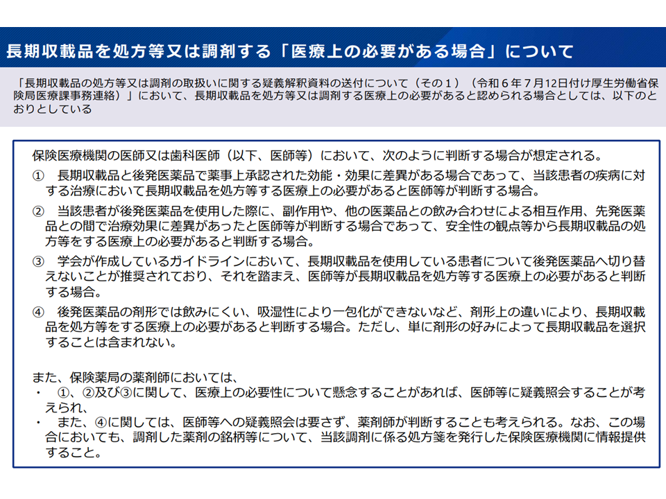 まず(1)の長期収載品については、昨年(2024年)10月から医療上の必要性がないにもかかわらず、患者が「後発医薬品でなく先発品(長期収載品)を使いたい」と希望した場合には、両者の差額の4分の1を患者自身が負担する仕組み【選定療養】が導入されています。