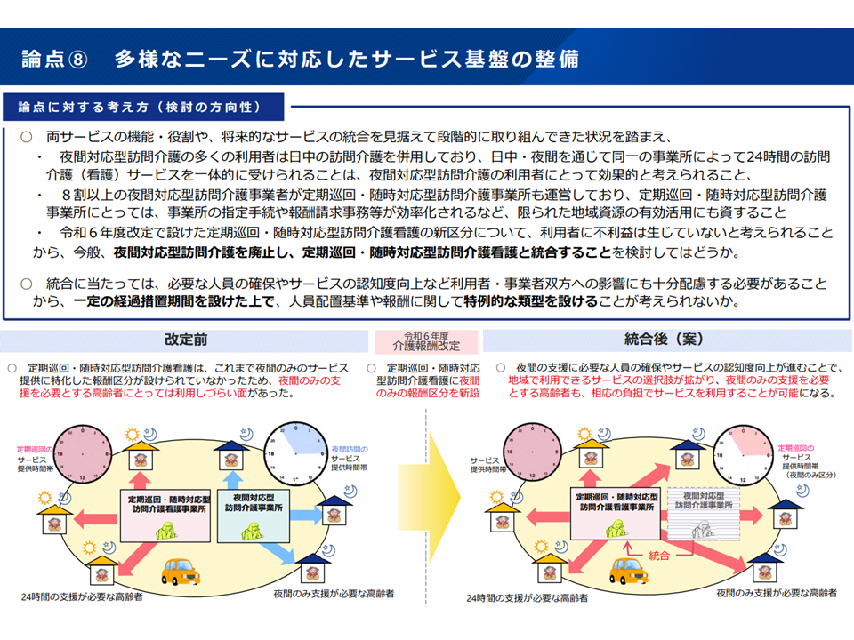 ▽一定の経過措置期間などを設けたうえで、【夜間対応型訪問介護】を廃止し、利用者像の類似する【定期巡回・随時対応型訪問介護看護】と統合する(2024年度介護報酬改定でも議論された点、関連記事はこちら会)