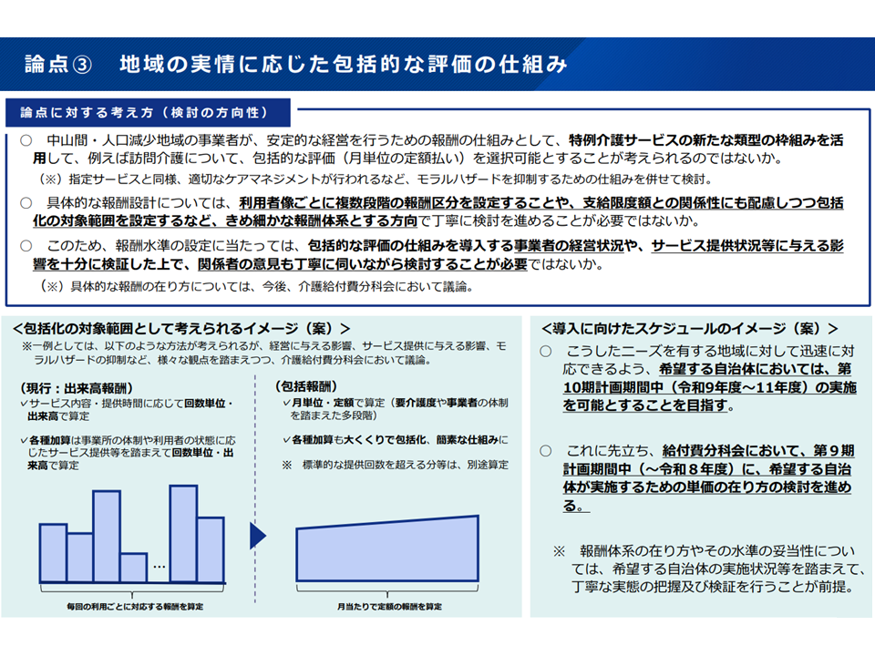 こちらも詳細は介護給付費分科会で議論することになりますが、厚労省は、少し具体的に▼「月額の定額報酬」(1か月あたり●単位)が考えられるが、利用者の要介護度や事業者の体制を踏まえた多段階に設定することが必要ではないか▼各種の加算(認知症専門ケア加算、口腔連携強化加算など)も「大くくりで包括化」し、簡素な仕組みとすべきではないか▼月額の定額報酬であるが、「無制限に何回、訪問介護を利用しても●単位」としたのではモラルハザードが生じてしまうため、「標準的な提供回数」を定め、それを超過する利用分は別途の報酬請求を可能としてはどうか(例えば「1か月に◆回までは●単位、超過分は回数に応じた報酬を出来高算定する」など)▼第10期(2027-29年度)の介護保険事業(支援)計画での実施を目指す(介護給付分科会で26年度までに単位数や算定ルールなどを設定する)▼報酬体系の在り方や水準については、包括報酬設定を希望する自治体(中山間・人口減少地域)の実施状況などを踏まえて、丁寧な実態把握・検証を⾏う—などの考えを示しています。