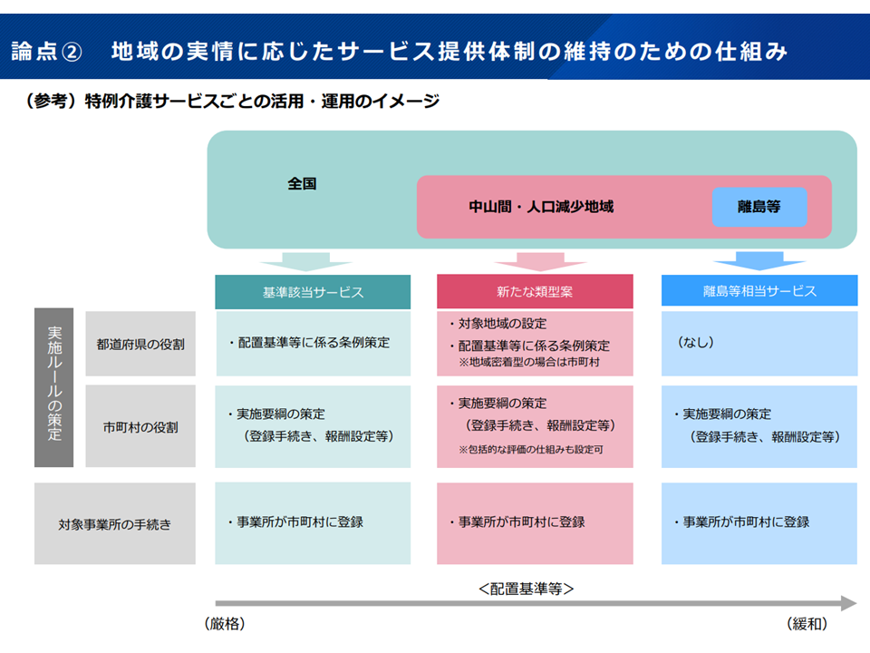 また、佐藤主光委員(一橋大学国際・公共政策大学院、大学院経済学研究科教授)から「走りながら考えて、ボトルネックを明らかにすべき。したがって新類型の適用場面(上述のとおり「やむを得ない場合」への限定など)をできるだけ広く考えるべき」との、津下一代委員(女子栄養大学教授)から「今後、中山間・人口減少地域に類似した地域が日本全国で増えていく。その点では、新類型がテストケースと言えるため、十分に検証を行い、将来の介護保険制度『大改革』に活かすべき」との考えが示されたほか、自治体サイドから「実際に中山間・人口減少地域で何人のスタッフが必要となり、確保できるのかを調査すべき」との提案も出ています。