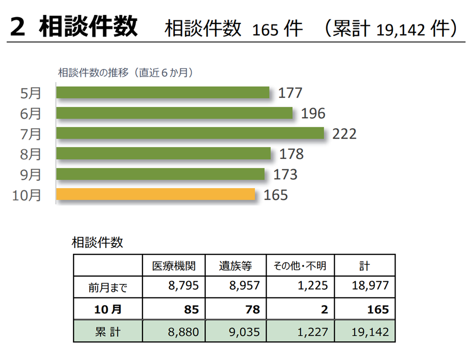 今年(2025年)10月に新たにセンターへ寄せられた相談の内訳は、▼医療機関等から85件▼遺族などから78件▼その他・不明2件―でした。制度発足からの累計では、▼医療機関等から8880件▼遺族などから9035件▼その他・不明1227件—となっています。