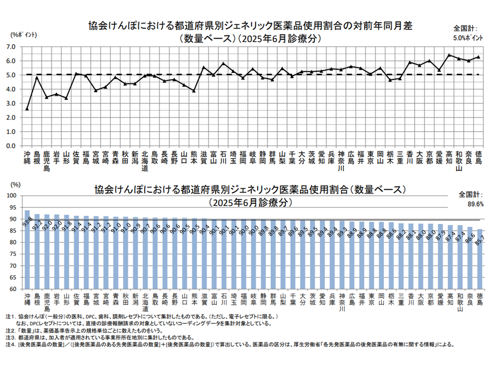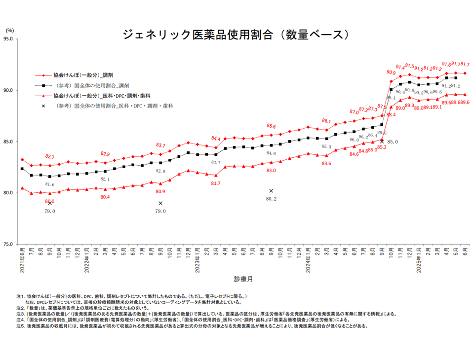 協会けんぽ全体の後発品割合、2025年6月にDPC等含めて89.6%・調剤分だけでは91.7%で、再び「踊り場」に入ってしまう
