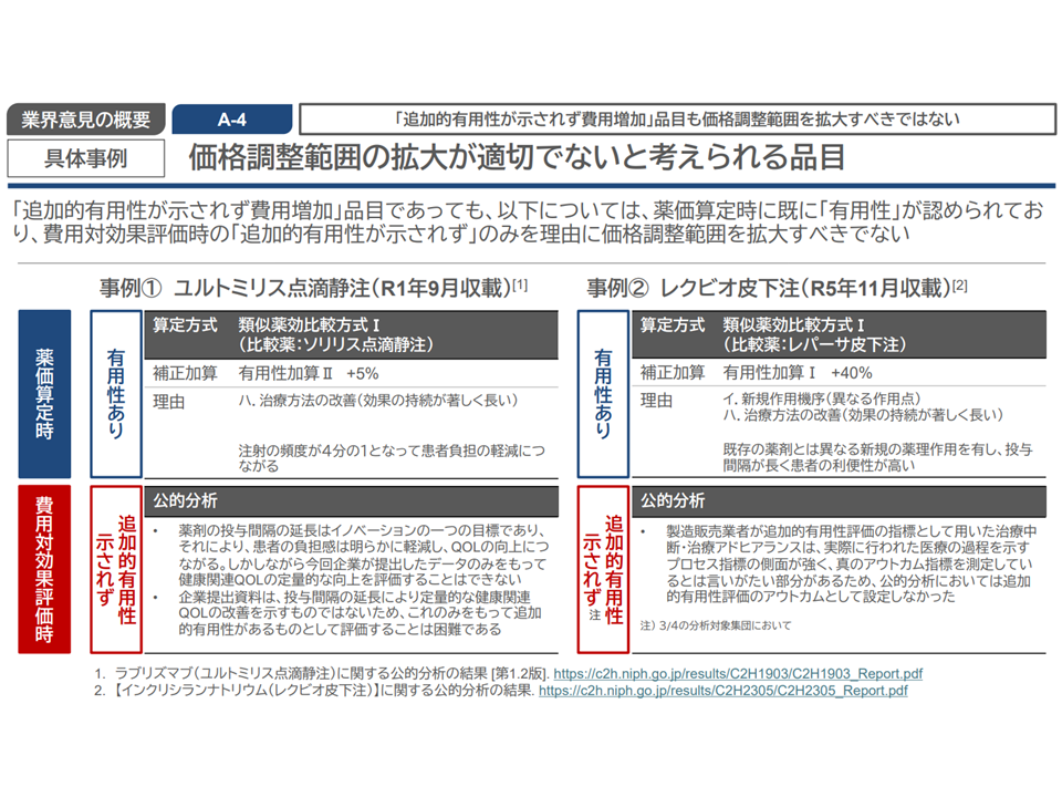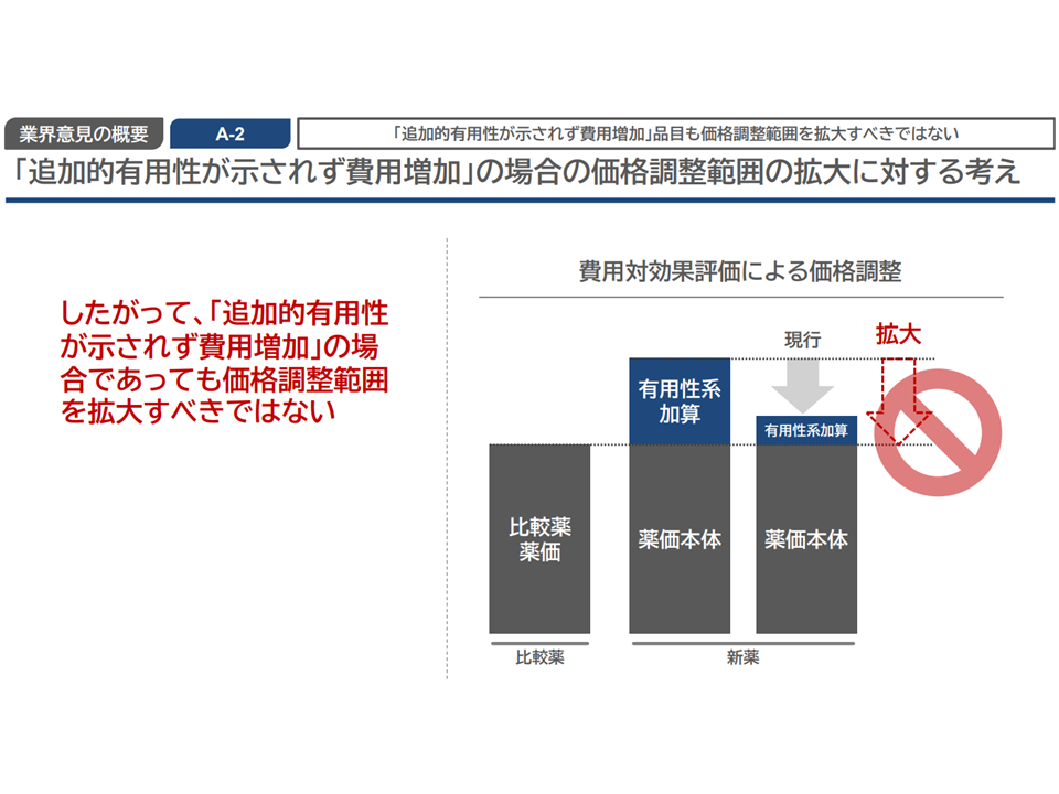 また同日の費用対効果評価専門部会では、2026年度の費用対効果評価制度改革に向けた業界ヒアリングが行われ「薬価等設定時に認められた有用性を否定することになる価格調整範囲の拡大は許されない」などの意見が出ています。