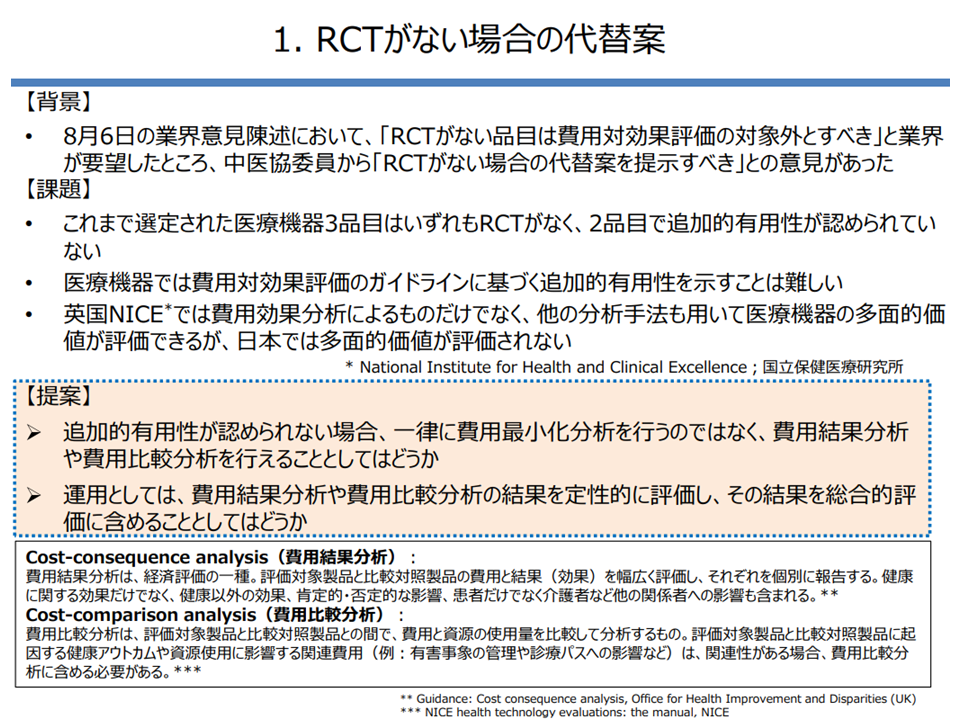 他方、医療機器サイドからは、▼医療機器においてRCT(無作為化比較試験)がない場合の分析・評価にあたっては「費用結果分析」「費用比較分析」結果を定性的に評価し、その結果を総合的評価(アプレイザル)に含めてはどうか▼費用対効果評価において、企業が希望する場合は「追加的にデータの収集を行える」こととしてはどうか▼追加的有用性が示されなかった場合も、現行の調整体系、係数を維持すべき(製薬サイドと同旨)▼チャレンジ申請をしている製品については、費用対効果評価の対象品目から除外する、もしくは市場規模の変化の金額をもって市場規模として選定することとしてはどうか―との提案がなされています。