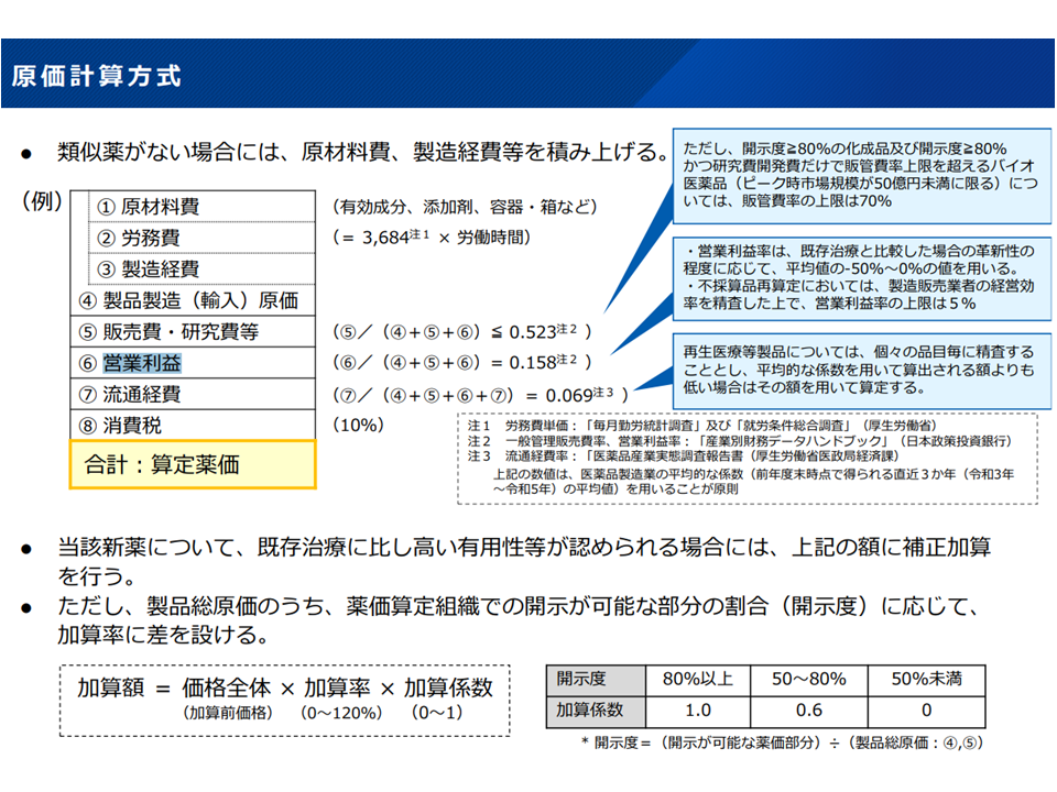 条件・期限付き承認を受けた再生医療等製品について、まだ有用性が「推定」にとどまっている段階なので、有用性系加算は付与せず、原価計算方式で薬価・材料価格を算定するにあたって営業利益率は「通常の値(平均的な営業利益営率)の2分の1」に設定する―。