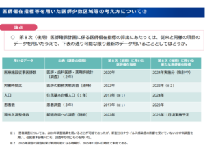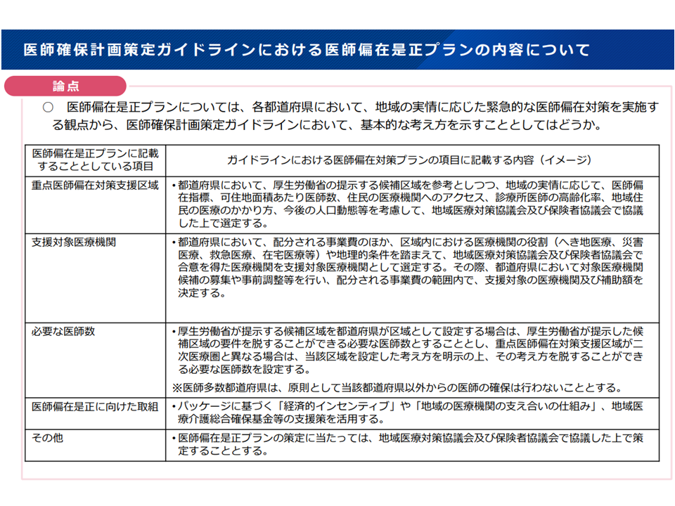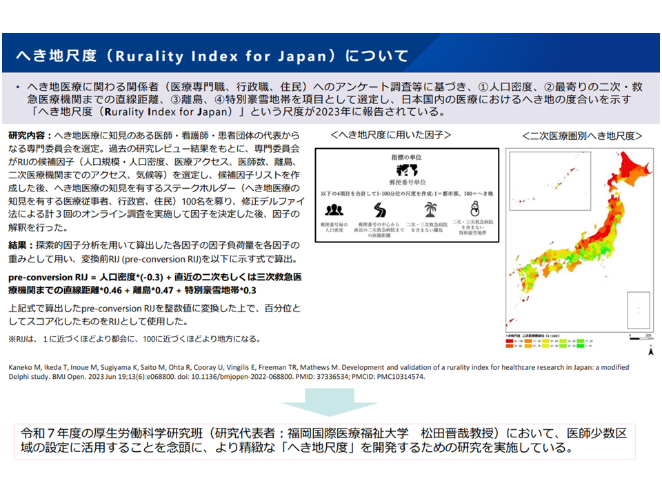 現在、松田晋哉構成員(福岡国際医療福祉大学ヘルスデータサイエンスセンター所長)を中心とした研究班で「へき地尺度の精緻化」研究が進んでおり、それを踏まえて「医師少数区域の拡大」を検討していくことになるでしょう。