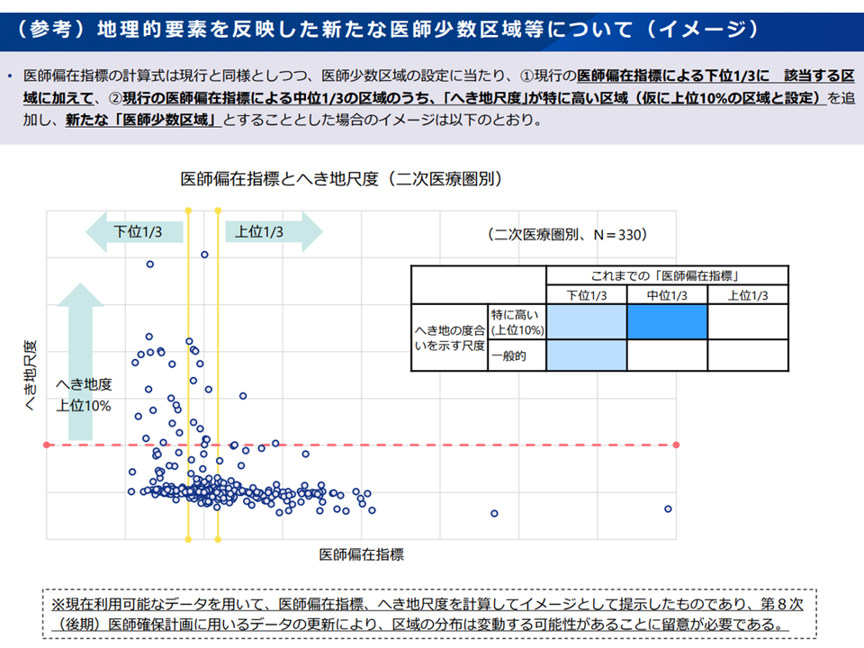 この医師少数区域に、新たに「へき地尺度」という考え方を導入し、「へき地尺度が上位10%の地域」(医療へのアクセスが困難な地域)も「医師少数区域」に加えてはどうか。ただし、この地域は「医師が少ない」わけではないため、医療へのアクセスの「補完」対策に積極的に取り組むこととしてはどうか―。