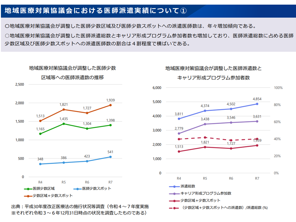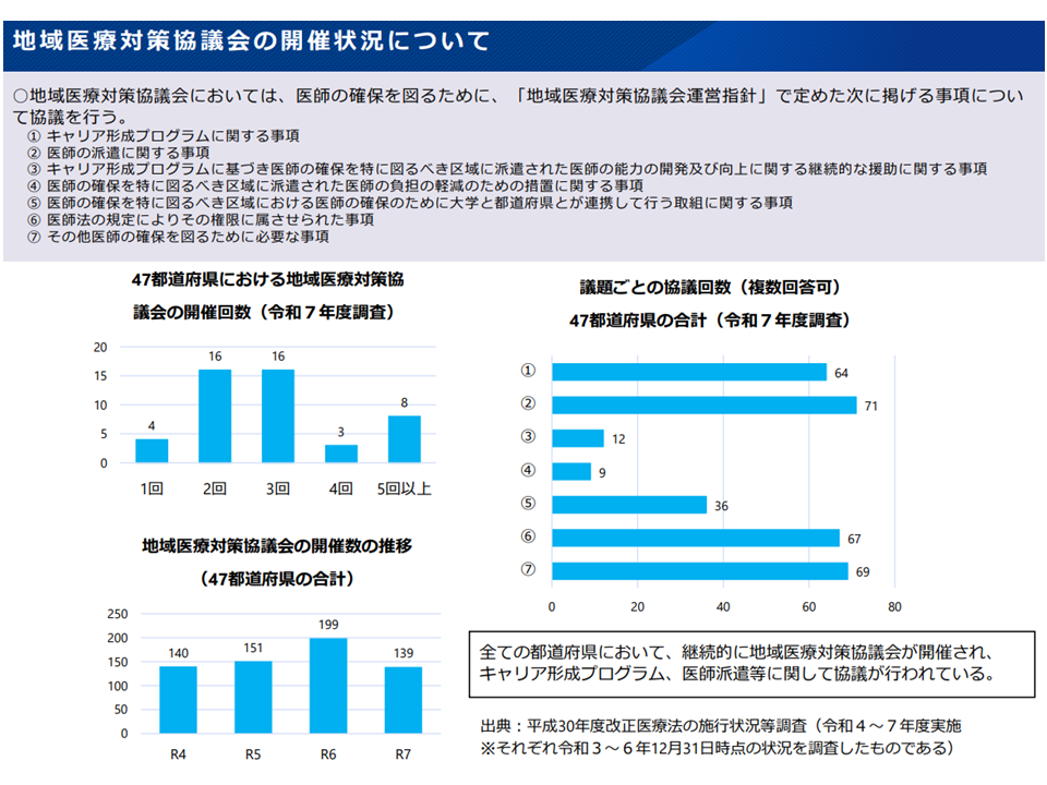 (6)「全国的な医師マッチング機能の支援」(医師に来てほしい地方医療機関と、地方勤務を希望する医師とのマッチング)、「リカレント教育の支援」(総合診療能力の確保支援)、「都道府県と大学病院等との連携パートナーシップ協定の推進」、「医学部定員・地域枠の在り方見直し」などの実施