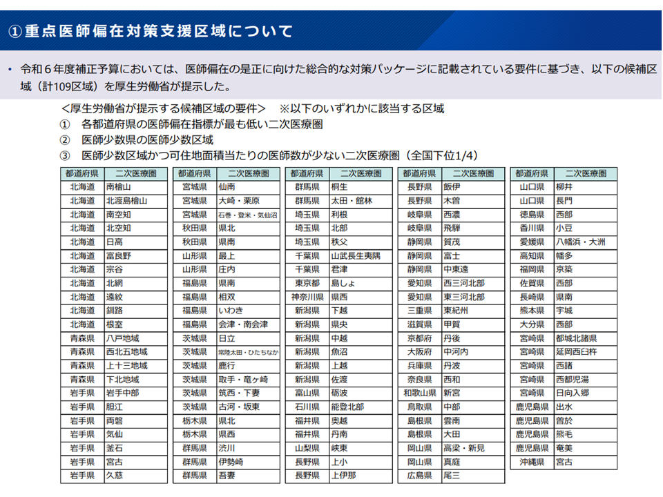 このうち(1)の「重点医師偏在対策支援区域」については、厚労省が「109地域」(各都道府県の偏在指標が最も低い2次医療圏、医師少数県の医師少数区域、医師少数区域かつ可住地面積当たりの医師数が少ない二次医療圏(全国下位4分の1)のいずれか)を提示(いわば候補)し、これを参考に都道府県が設定・指定します。