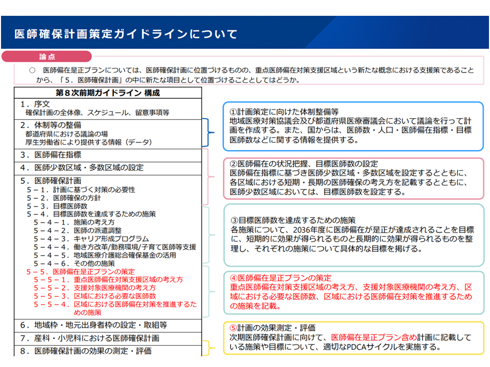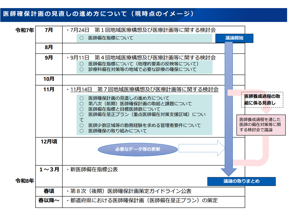 医師確保計画は「3年単位」の計画であり、現在は「2024-26年度」の第2期計画が稼働しています。「2027-29年度」を対象とする第3期計画に向けて、上記のような議論をさらに続け、今年度中(2026年3月末まで)の意見取りまとめを目指します。