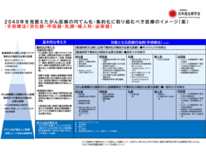 こうした状況を改善する手立ての1つとして検討されているのが「手術症例の集約化」です。高度な手術を「地域の基幹的な病院」などで集約して実施することで、「当該病院に外科医が集まる→個々の外科医の負担が軽減する」ことにつながると期待されるのです(同じ人数の医師が多くの施設に分散した場合、何から何まで少ない医師で対応せざるを得ないが、集約化することでシフトが組みやすくなるなど1人1人の負担が減ると期待される)。また、この集約化は手術成績の向上など「医療の質の向上」にもつながります。このため、例えば新たな地域医療構想論議の中でも「急性期拠点機能を持つ病院の集約化」(人口20-30万人ごとに1か所程度に集約化)方針が明確になっているのです(関連記事はこちらとこちら)。