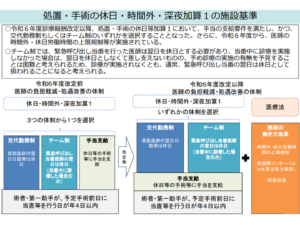 ▼交替勤務制の導入▼チーム制の導入▼時間外手術等の手当て支給—のいずれか行っていること(選択的要件、関連記事はこちら)