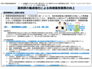 また(5)の病院薬剤師については、その確保が難しい点が従前より指摘されています。この点について診療報酬では「病院薬剤師の業務を評価する→病院の収益が上がる→病院薬剤師の処遇改善を図る→病院薬剤師の増員につながる」というサポートの仕方が考えられるでしょう(関連記事はこちら)。