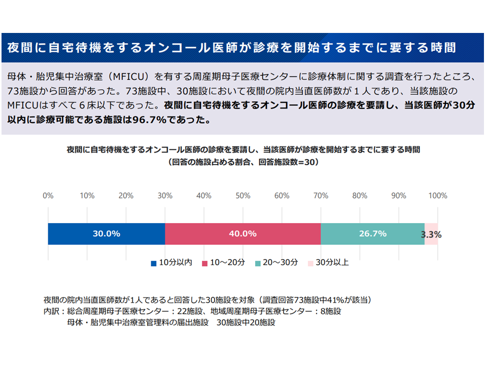 ▽夜間に自宅待機するオンコール医師を要請した際、MFICUを有する周産期母子医療センターの96.7%が「当該医師が30分以内に診療可能」である