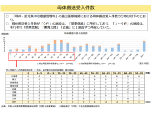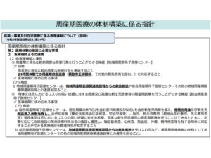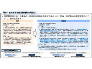 このため、混合病棟においては、母子の安定・安全に配慮するため▼産科区域を特定して管理する▼助産師の配置等において、妊産婦の継続的なケアや、産後ケア事業等の母子保健事業との連携を円滑に行える―ようにすることが重要と考えられます。