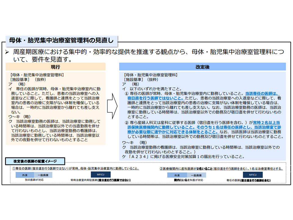 まず(a)の母体・胎児集中治療室については、診療報酬では【母体・胎児集中治療室管理料】として評価され、2024年度の診療報酬改定では▼ユニット内に常時勤務する専任医師が「宿日直を行う医師」ではないこと▼専ら産婦人科・産科に従事する医師(宿日直を行う医師を含む)が常時2名以上「院内」に勤務し、うち1名を専任として、ユニットで診療が必要となった際に速やかに対応できる体制をとること―という施設基準の厳格化・明確化が図られました。