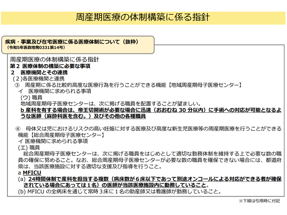 ▽国の指針「疾病・事業及び在宅医療に係る医療体制について」では、MFICUについて「24時間体制で産科を担当する複数(病床数が6床以下で別途オンコール対応ができる者が確保されている場合には1名)の医師が当該医療施設内に勤務していること」とされている