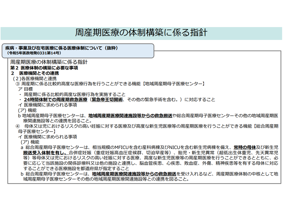 ところで、指針では、周産期母子医療センターに対し▼地域周産期医療関連施設等からの救急搬送を受け入れる▼24時間体制での緊急帝王切開術等に対応する―ことなどを求めています。