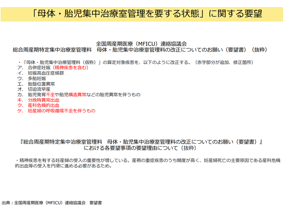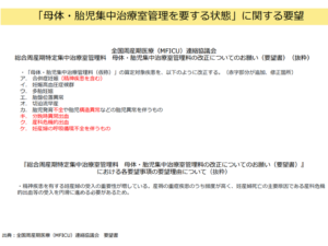 MFICU(母体・胎児集中治療室)について、国の整備指針「疾病・事業及び在宅医療に係る医療体制について」に沿う形で「専任医師要件の緩和」「母体搬送受け入れや帝王切開術実施に関する実績基準の設定」などを行ってはどうか―。