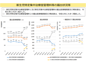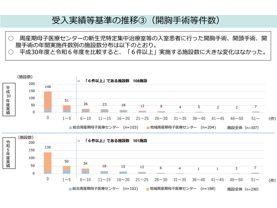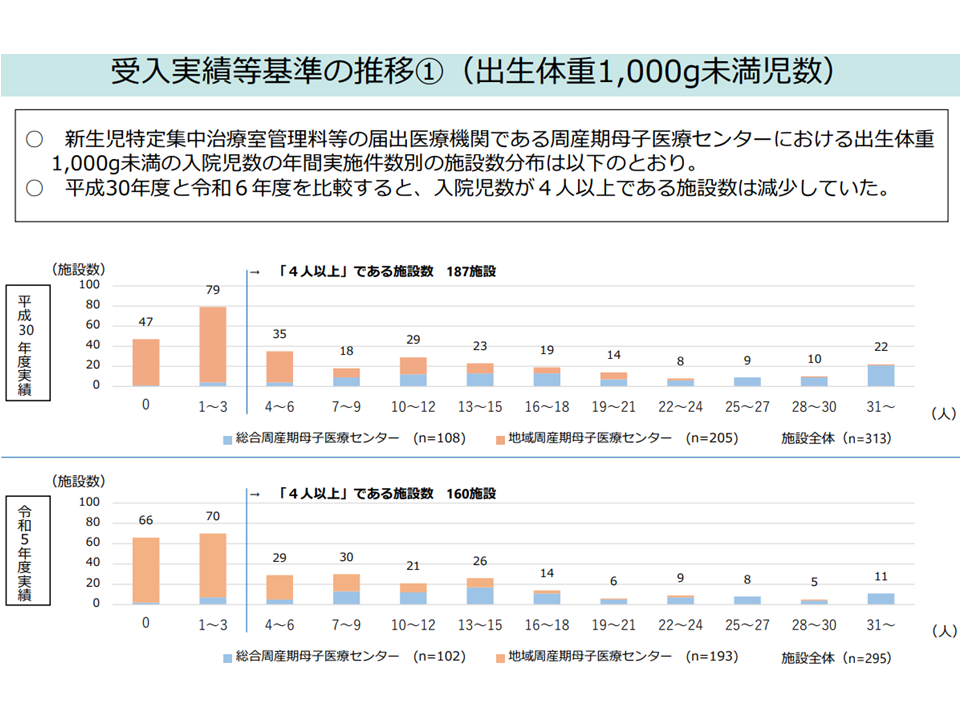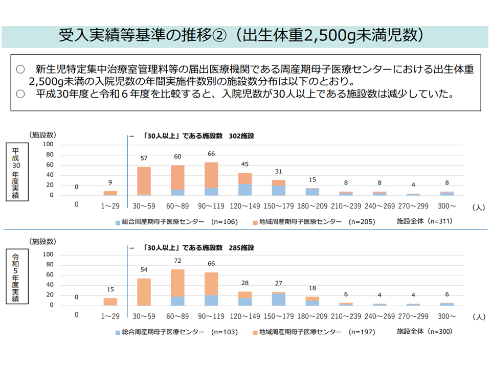 これらのデータからは、施設基準で求められている実績要件(選択要件の1つ)のうち「低出生体重児の受け入れ」要件クリアに苦しんでいる施設が増えていることがうかがえます