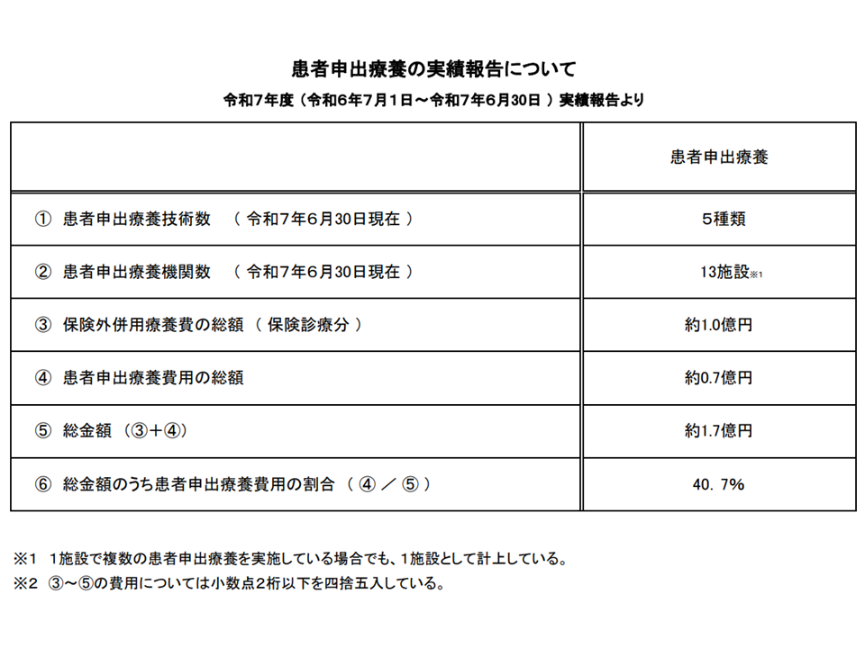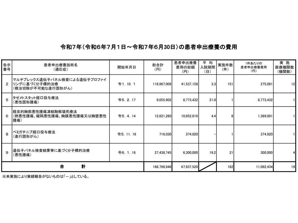 ▼本年(2025年)6月30日時点で5種類の技術が稼働し、昨年(2024年)7月から本年(2025年)6月の1年間で13施設において182症例に実施され、保険外併用療養費の総額(保険診療分)は約1億円・患者申出療養費用の総額は約7000万円となった