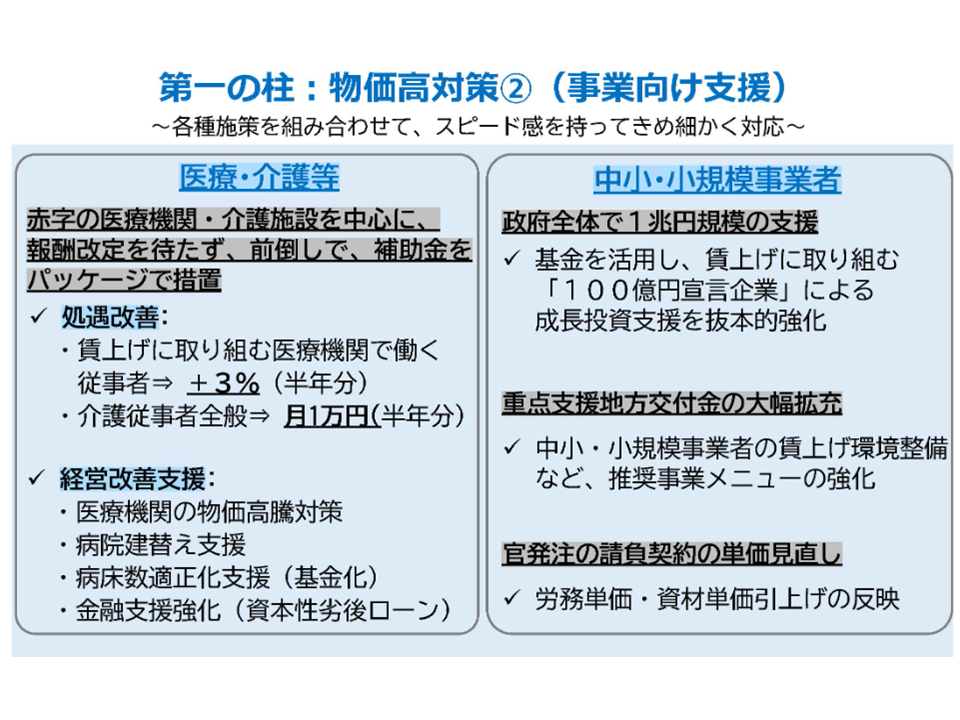 前者の今後策定される「医療・介護等支援パッケージ」に基づいて、政府内で2025年度補正予算案を組む(この中で介護職員の処遇改善への手当も行う、後述)とともに、後者のように2026年度に期中(臨時)の介護報酬改定を行い「さらなる処遇改善に向けた報酬上の対応を行う」ことが伺えます。