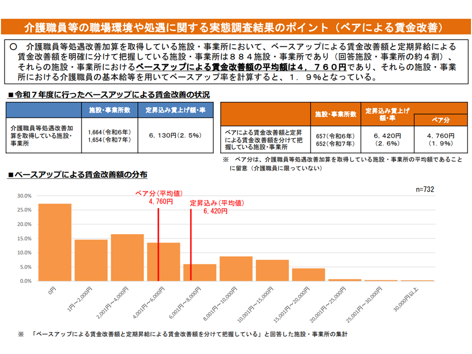 ▽介護職員等処遇改善加算を取得している施設・事業所において、ベースアップによる賃金改善額と定期昇給による賃金改善額を明確に分けて把握しているところは884(回答施設・事業所の約4割)あり、うちベースアップによる賃金改善額(平均)は4760円で、ベースアップ率に換算すると1.9%であった