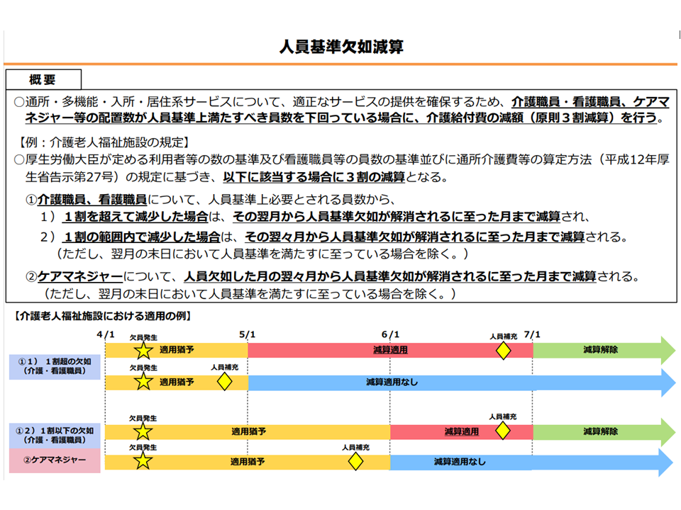 この点、新たなスタッフの確保ができない場合には、「サービスの質確保や利用者の安全が確保できなくなってしまう」ために、次のように「介護報酬を3割減算する」という厳しいルールが設けられています。