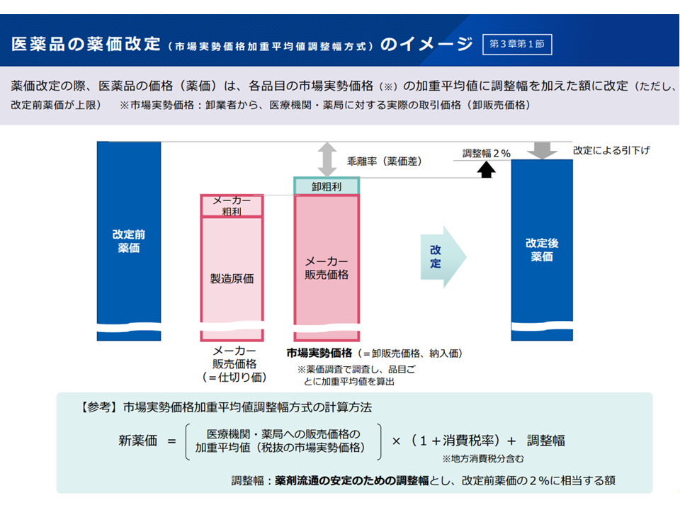 ▽実勢価格を踏まえた薬価改定では、「乖離率(実勢価格(販売価格・購入価格)と薬価との乖離)-調整幅2%」の薬価引き下げが行われる(調整幅は流通経費などを勘案したもの)