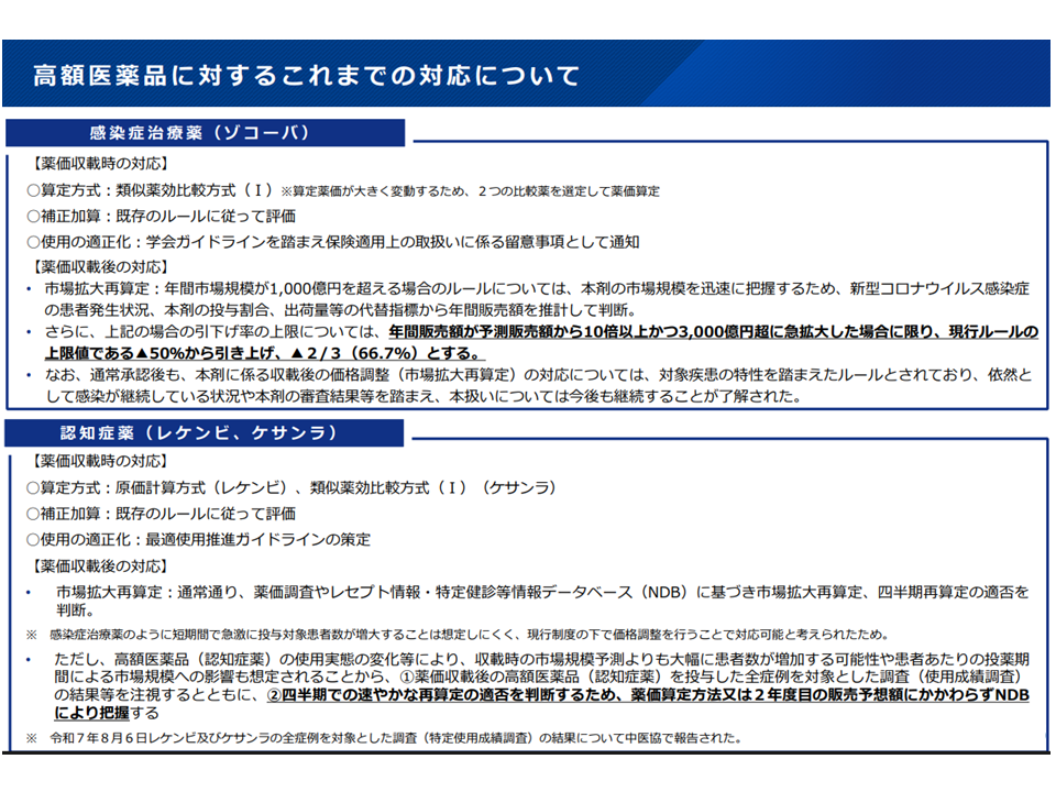 このため2022年度薬価制度改革において「年間1500億円の市場規模を超えると見込まれる品目が薬事承認された場合には、通常の薬価算定の手続きに先立ち、直ちに中医協総会に報告し、当該品目の承認内容や試験成績などに留意しつつ薬価算定方法を議論する」というルールが設けられました。このルールに基づき▼コロナ感染症治療薬のゾコーバ▼認知症治療薬のレケンビ、ケサンラ―について特別の薬価算定ルールが適用されています。