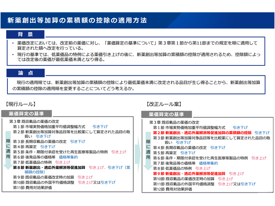 新薬創出・適応外薬解消等促進加算など、「わかりやすい」ものとなるように名称変更
