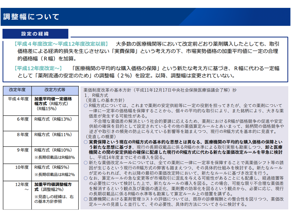 ・一律2%に固定されている点に疑問を持っている。カテゴリ別(新薬創出等加算対象の新薬/同加算対象外の新薬/長期収載品/後発品など)、剤型別、薬価別などの切り口で、調整幅にも「区分」を設けてはどうか(支払側の松本委員)