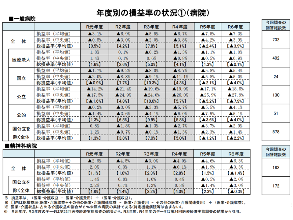 一般病院全体の損益([医業収益+介護収益]-[医業・介護費用])比率は、改定前の2023年度には平均値でマイナス7.5%、中央値でマイナス4.2%でしたが、改定後の2024年度には平均値でマイナス7.3%、中央値でマイナス3.9%となりました。
